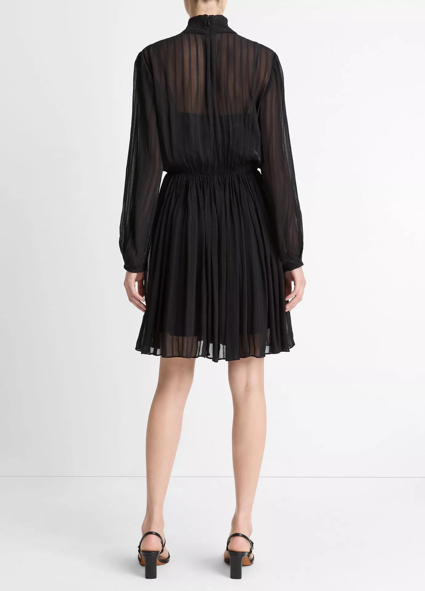 A sheer, crinkled stripe fabric imbues our mock-neck dress with mesmerizing dimension and movement. Take heed: we finished it with an elasticized waist for our signature touch of covert comfort.